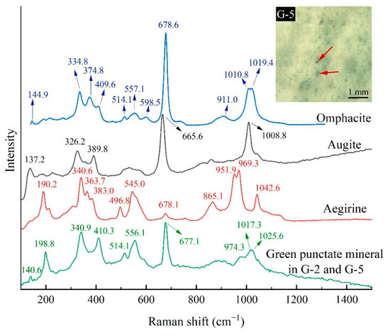 Raman spectra of the green mineral inclusions in the Guatemalan samples (G-2, G-5), which are mainly omphacite and some aegirine–augite mixture. The reference spectra of omphacite, augite, and aegirine are plotted from the RRUFF database (No. R061129, R070231, and R040054) [54].