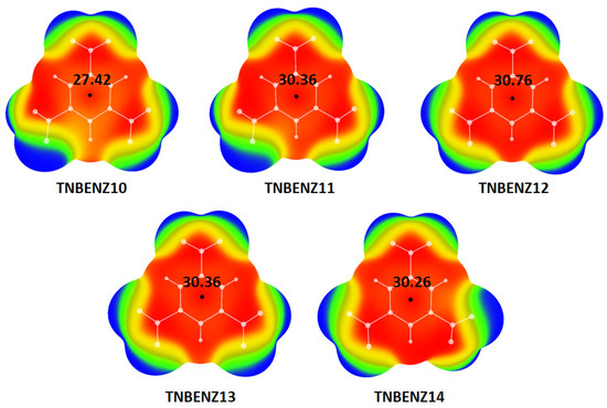 Calculated values of positive electrostatic potential above the central area of molecular surfaces are: 27.42 kcal/mol for TNBENZ10; 30.36 kcal/mol for TNBENZ11; 30.76 kcal/mol for TNBENZ12; 30.36 kcal/mol for TNBENZ13 and 30.26 kcal/mol for TNBENZ14. These values were compared to previously calculated values of electrostatic potential for computationally optimized geometry of TNB molecule (Table 1) [16].