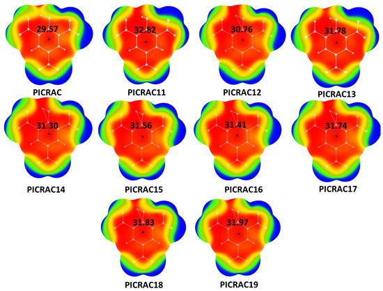 Large deviations from electrostatic potential values calculated for optimized geometry were also found for all the other geometries extracted from crystal structures: PICRAC19 (16.31%), PICRAC18 (15.78%), PICRAC13 (15.62%), PICRAC17 (15.48%), PICRAC15 (14.82%), PICRAC16 (14.27%) and PICRAC14 (13.86%).