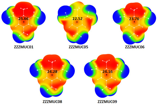 Vmax values calculated for geometries extracted from selected crystal structures (Figure 4) were in the range of 22.52–25.66 kcal/mol. Generally, this is in good agreement with the Vmax value obtained for the computationally optimized geometry of TNT (23.76 kcal/mol) [16]. Only in cases of ZZZMUC01 and ZZZMUC05 relatively large deviations were observed (7.98% and 5.20%, respectively).