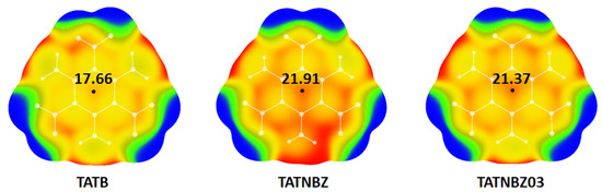 The Vmax values calculated for geometries extracted from selected crystal structures (Figure 5) were 21.91 kcal/mol for TATNBZ crystal structure and −21.37 kcal/mol for TATNBZ03 structure. For both structures there was a significant difference in the electrostatic potential value compared to the computationally optimized geometry of TATB molecule (17.66 kcal/mol). Calculated deviations are given in Table 4.