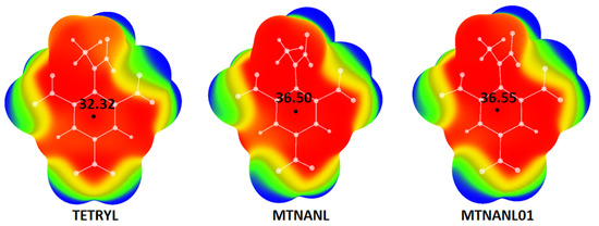The Vmax values calculated for geometries extracted from selected crystal structures (Figure 6) were 36.50 kcal/mol for MTNANL crystal structure and −36.55 kcal/mol for MTNANL01 structure. For both structures there was a significant difference in the electrostatic potential value compared to the computationally optimized geometry of TETRYL molecule (32.32 kcal/mol). Calculated deviations are given in Table 5.