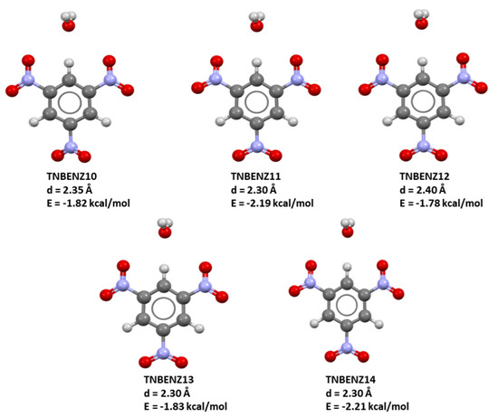 TNB/H2O model systems containing TNB geometries extracted from crystal structures and artificially added water molecules. Calculated energies of the strongest interactions with corresponding O…H distances were given below every model system.