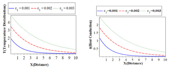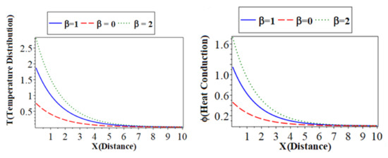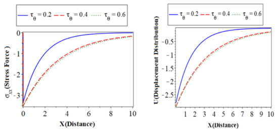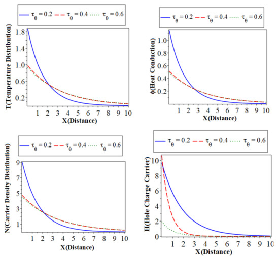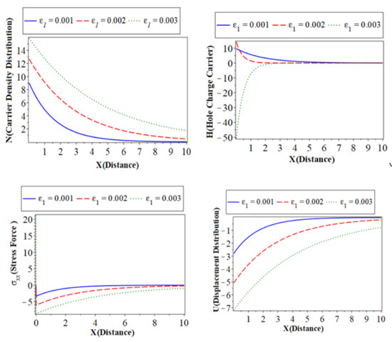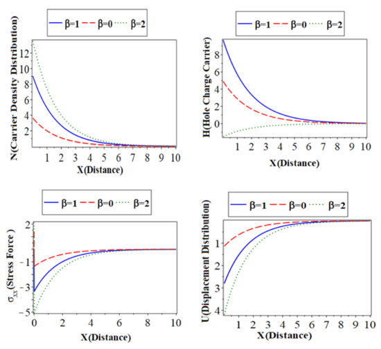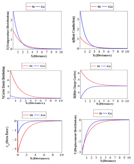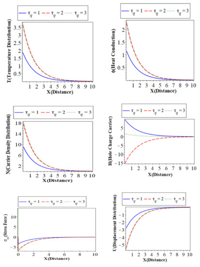 ) with a green color curve show the case at . The first, second, and third subfigures are the temperature () distribution, heat conduction, and the carrier density distribution with the distance , which takes on the same behavior as the first category. The fourth subfigure describes the hole charge carrier with the distance. This subfigure shows that the amplitude values of the hole charge carrier distribution increase with the decrease in the values of the thermoelastic. The fifth subfigure shows that the increase of stress force amplitude, due to the mechanical loads, tends to increase the value of the phase-lag of the heat fluxes. The sixth subfigure represents the wave propagation of displacement distribution against the horizontal distance . The displacement distribution starts from the maximum positive value for all three cases. In the case of the distribution takes on the exponential behavior with a smooth decrease. On the other hand, when the distribution of displacement decreases sharply in the first range, and it takes on exponential propagation behavior until it reaches a minimum value near the zero line [31]. The numerical results show that each field of physical quantities is significantly influenced by the phase-lag of the heat flux [32].