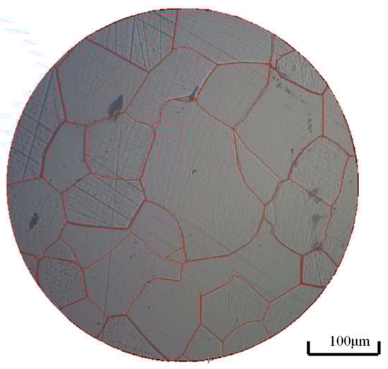 This paper adopts the method of combining metallographic tests and scanning electron microscope tests to characterize the size of the grain and grain boundary of silicon steels. Among them, the metallographic test is uniformly carried out with the XQ-1 metallographic sample inlay machine produced by Shanghai Optical Instrument No. 5 Factory Co., Ltd. (Shanghai, China). Then use 800-mesh, 1000-mesh, 1500-mesh, and 2000-mesh water abrasive papers for grinding in turn until the surface of the sample has no visible scratches. The grinding machine is a MPD-1 semi-automatic single-disk fixed-speed metallographic grinding machine produced by Zhejiang Ningbo Precision Testing Instrument Co., Ltd. (Ningbo, China). After grinding, polish with W1.0 polishing agent on a P-1 polishing machine produced by Shanghai Jingzhuan Instrument Co., Ltd. (Shanghai, China) until it is polished to a mirror surface. Then rinse with deionized water and dry quickly with a hair dryer, using a cold windshield to prevent oxidation. After drying, the samples were corroded with a 4% nitric acid alcohol solution and rinsed with a large amount of deionized water immediately after corroding for 10~15 s. Then use a hairdryer to dry quickly. Repeat the above steps many times until clear grain and grain boundary structures can be observed under a metallographic microscope, and then photographed for preservation. The pictures after taking pictures are statistically analyzed with the metallographic analysis software of Shangguang No. 5 Factory (Shanghai, China), and the grain size is counted and calculated. It should be noted that when calculating the results, it is necessary to ensure that the number of grains counted for each sample is more than 50, so that the model error when establishing the simulation model can be guaranteed to be within 2%. The results after metallographic software analysis are shown in Figure 2. The samples after the metallographic test were treated with gold spraying, and the crystallinity of the silicon-infiltrated steel plate was examined by a scanning electron microscope (SEM, ZEISS EVO MA15, Carl ZEISS SMT Ltd., Cambridge, UK) under the condition of an accelerating voltage of 15 kV. The SEM image of the grain boundary is shown in Figure 3, and ImageJ software is used to count the size of the grain boundary for the scanned grain boundary image. Likewise, the same sample is counted more than 50 times. It is worth noting that when calculating the size of grains and grain boundaries, the size of grains and grain boundaries on the cross-section needs to be included in the calculation, so that the subsequent modeling can be closer to the actual parameters. The characterization of mechanical properties is mainly to detect the brittleness of Fe-6.5 wt%Si silicon steel prepared by the CVD method, and the tensile test method is used. The reason for using the tensile test method is to reflect the mechanical properties of the silicon steel sheet through the stress-strain curve, and to obtain the simulation data through the tensile test. During the tensile process, the ZES-25-9554 electronic extensometer produced by Hubei Kaihang Intelligent Equipment Co., Ltd. (Shiyan, China) was used to measure the displacement change, and the KY-D4204 tensile testing machine produced by Jingyue Electronic Technology Co., Ltd. was used to conduct the tensile test. Since the silicon steel plate is only 0.3 mm thick, the shape of the tensile sample is a nonstandard sheet sample. The standard distance of the sample is 20 mm, the thickness is 0.3 mm, the width is 5 mm, and the head width is 25 mm. The remaining dimensions are calculated from the above dimensions.