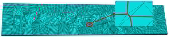 where is the average grain size and is the average grain boundary thickness. Combined with the grain size and grain boundary width measured in the previous subsection, the model can be carried out after obtaining the grain boundary proportion using Equation (3). In the modeling process, the meshing of the geometric model will have a very important impact on the results of the simulation calculation. The meshing mainly includes tetrahedral meshes, hexahedral meshes, and wedge meshes. Due to the 3D Voronoi model being adopted, the grain boundaries are irregular, and it is often difficult to mesh with a tetrahedral mesh, so the hexahedral mesh is used for mesh division. The Voronoi model after modeling and the partially enlarged grain boundary diagram are shown in Figure 4. To facilitate the simulation analysis, this paper scales the model and builds a 1/10 model of the original sample. In a simulation, in order to shorten the analysis time, only the sample standard distance segment is modeled during modeling.