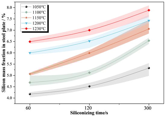 The mass fraction of silicon in the steel plate after silicon infiltration at different temperatures and times.
