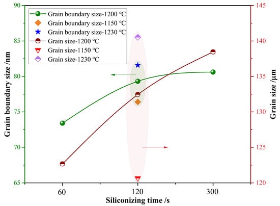 As can be seen from Figure 5, as the silicon infiltration time increases, the silicon mass fraction in the steel plate also increases, but it is not proportional to the time. The higher the silicon mass fraction of the target, the longer it will take to infiltrate the same amount of silicon. When the temperature reaches more than 1050 °C, the silicon mass fraction in the steel plate can reach approximately 6.5% by adjusting the silicon infiltration time. That is, it is only necessary to ensure that the permeated silicon temperature is higher than the vaporization temperature of FeCl2, and that the temperature and time can be adjusted. To facilitate subsequent analysis, the mass fraction of silicon in the steel plate needs to be relatively close. Therefore, combined with the conclusions in Figure 5, the influence of silicon infiltration time on the grain boundary size is studied when the silicon infiltration temperature is 1200 °C, and the influence of silicon infiltration temperature on the grain boundary size is investigated when the silicon infiltration time is 120 s. The statistical results of grain and grain boundary size after silicon permeation at different temperatures and different times are shown in Figure 6.