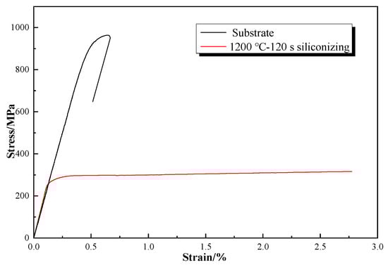 Tensile stress—strain curve of silicon steel and matrix after silicon permeation of the material after siliconization at 1200 °C for 120 s.