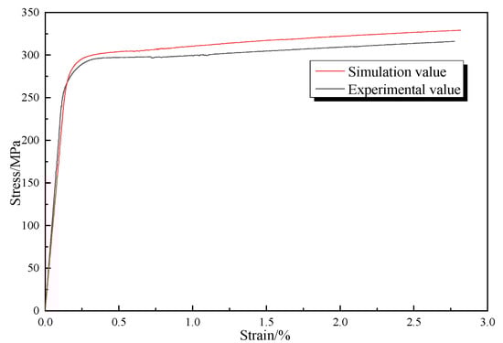 Comparison of simulated and tested tensile stress-strain curves of the material after siliconization at 1200 °C for 120 s.