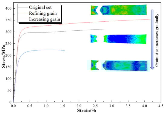 It is not difficult to see from the tensile stress-strain curve in Figure 8 and the tensile fracture in Figure 9 that the simulation model is relatively close to the test result, and the error value is within 5%, and it can be considered that the simulation model has a good alternative effect to the experimental effect. In the stress-strain graph, the value of strength exhibited by the simulated curve is slightly higher than that exhibited by the experimental one. This is because, during the experiment, when the yield stage is reached, the extensometer needs to be removed in the process, which will have a certain impact on the results. Therefore, a longer parallel segment will appear in the test results, and then the force will continue to increase. In addition, the fracture position in both the simulation and the test results is near the edge of the gauge distance, which may be due to the unidirectional stretch used. Due to the equipment factors of the stretching machine itself, the force loading during the stretching process is too fast, resulting in the instantaneous force of the stretching side being greater than that of the clamping side, which makes the fracture gap closer to the stretching side. Based on the above model, adjust the size of the grain and grain boundary in the model, change the structure of the grain (polyhedral grain becomes a columnar grain), and then use the above model to infiltrate silicon. The tensile simulation results after adjusting the grain and grain boundary size are shown in Figure 10, where the grain boundary size is increased or decreased accordingly according to the law obtained by the experiment.