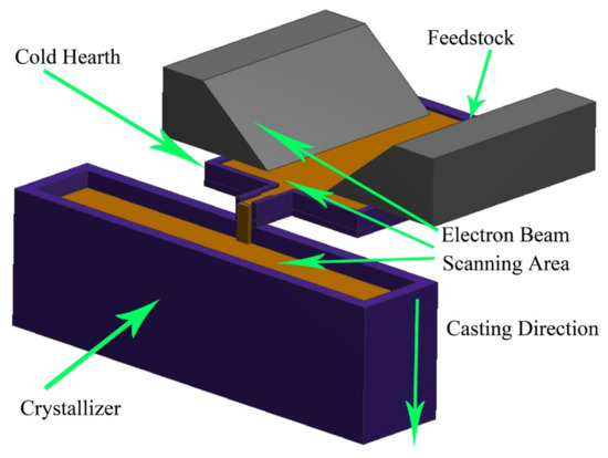 The main problem limiting the wider use of titanium and its alloys is the high cost of its production. In the metallurgical industry, electron beam cold hearth melting (EBHM) is often used to produce titanium and titanium alloy ingots; this has an excellent ability to remove high and low density inclusions [3]. This device uses high-energy electron beams to scan the feedstock. The feedstock melts and flows into a cold hearth for refining and then into a crystallizer, where it solidifies and is removed under a high vacuum (Figure 1). Refining is a very important process. Some of the inclusions floating on the surface of the molten pool are melted by the high-energy electron beams and evaporated; some flow into the crystallizer, while others settle on the solidification shell during the cold hearth.