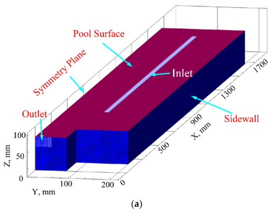 To improve the calculation efficiency, only a half-symmetrical part of the cold hearth was selected for calculation [16]. A region of the cold hearth with a width of 200 mm and a length of 1570 mm was established. The computational domain consisted of 1.1 million hexahedron cells. In the previous work, the cell parameters of different sizes have been verified and found that the cell parameters in this work have met the requirements. For this model, the perfect 90° hexahedron cell is achieved, with an aspect ratio of 0.95, determinant value of 0.97, and cell quality value of 0.98. The boundary conditions of the model (Figure 2a) were the pool surface, sidewall, symmetry plane, inlet, and outlet. The type of inlet is “velocity inlet” with different casting velocities, and outlet is “outflow”; the value is obtained from the actual production experience of the factory and the setting of incompressible fluid in the model.