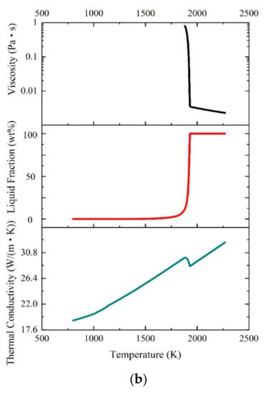 This model was coupled with the solidification of Ti-0.3Mo-0.8Ni alloy and DPM. Previous research [17,18] explained the necessity of the governing equations of mass conservation, energy conservation, and momentum conservation in the model, as shown by Equations (1)–(6). The mushy zone flow followed the enthalpy–porosity method for simulation [19]. The exact details regarding the models are found in the literature [20,21,22,23,24,25].