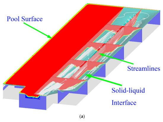 To study the movement of the inclusions in the cold hearth, the molten pool morphology was calculated. As shown in Figure 3a, the left side is the surface of the molten pool, and the right side is the internal slice of the molten pool, which shows the solid–liquid interface and the streamline of the melt. The streamline entered the cold hearth from the inlet, extended around, and then flowed out of the outlet. The farthest melt from the outlet had fewer streamlines and poor melt fluidity. Combined with Figure 3b, it can best reflect the characteristics of a molten pool and can also visually compare the differences of molten pool morphology under different casting process parameters, as can be seen from the cross-section of the molten pool, two parts below the inlet were the deepest, and the symmetry plane was relatively shallow; this caused the molten pool to appear W-shaped. The velocity field of the melt is analyzed in detail below. These factors affected the movement of the inclusions.