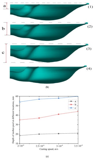 The influence of different casting velocities on the profile of the molten pool was studied. Figure 3b shows the molten pool morphology in four states using casting velocities of 2 × 10−4, 2.5 × 10−4, 3 × 10−4, and 3.5 × 10−4 m/s with a pouring temperature of 2273 K. The depth values of the three characteristic positions were studied to quantitatively analyze and determine the influence of casting velocity on the molten pool. These three characteristic positions are the deepest locations below the inlet, on the symmetry plane, and on the outlet (Figure 3b). The specific values for these depths are shown in Figure 3c. The depth of the molten pool increased with an increase in the casting velocity, and the solid–liquid interface gradually moved down.