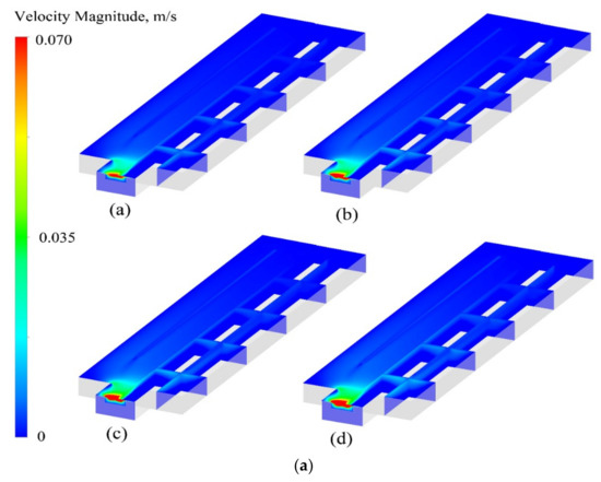 By studying the influence of casting velocity on the profile of the molten pool, it was determined that the cold hearth was sensitive to velocity. To study the effect of the flow field on the cold hearth, the state of the cold hearth’s velocity field was varied using casting velocities of 2 × 10−4, 2.5 × 10−4, 3 × 10−4, and 3.5 × 10−4 m/s with a pouring temperature of 2273 K (Figure 4a). With an increase in the casting velocity, the surface velocity and the velocity inside the molten pool gradually increased. The velocity magnitude near the outlet was noticeably higher than those of the other positions in the cold hearth. A lower velocity magnitude with poorer fluidity and stirring effect of the melt was observed as the distance from the outlet increased; this was more likely to produce defects such as segregation.