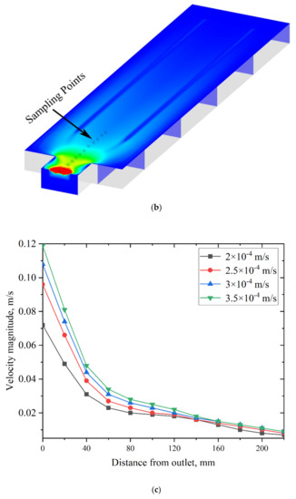 To show the trend of the velocity magnitude more intuitively (Figure 4b), an area with a length of 220 mm was selected on the surface of the cold hearth, and 12 sampling points were evenly selected. A line chart was created showing the relationship between the velocity magnitude and the distance of these sampling points (Figure 4c). As the cast velocity increased, the velocity on the surface of the cold hearth increased. When the distance was between 0 and 60 mm away from the outlet, the velocity dropped rapidly. When the distance was between 60 to 120 mm away from the outlet, the velocity decreased more slowly.