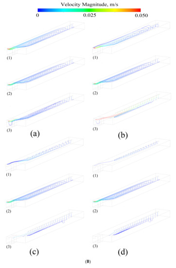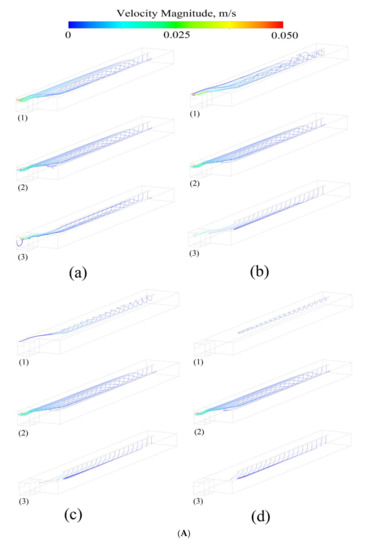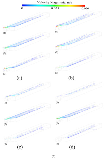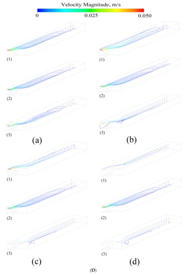 (A) The trajectory of inclusions with densities of (1) 3.5, (2) 4.5, and (3) 5.5 g/cm3 and diameters of (a) 10, (b) 40, (c) 70, and (d) 100 μm at a casting velocity of 2 × 10−4 m/s with a pouring temperature of 2273 K. (B) The trajectory of inclusions with densities of (1) 3.5, (2) 4.5, and (3) 5.5 g/cm3 and diameters of (a) 10, (b) 40, (c) 70, and (d) 100 μm at a casting velocity of 2.5 × 10−4 m/s with a pouring temperature of 2273 K. (C) The trajectory of inclusions with densities of (1) 3.5, (2) 4.5, and (3) 5.5 g/cm3 and diameters of (a) 10, (b) 40, (c) 70, and (d) 100 μm at a casting velocity of 3 × 10−4 m/s with a pouring temperature of 2273 K. (D) The trajectory of inclusions with densities of (1) 3.5, (2) 4.5, and (3) 5.5 g/cm3 and diameters of (a) 10, (b) 40, (c) 70, and (d) 100 μm at a casting velocity of 3.5 × 10−4 m/s with a pouring temperature of 2273 K.