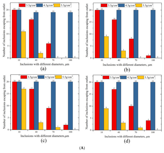The number of inclusions at a density of 3.5 g/cm3 escaping the outlet with different casting velocities and diameters is shown in Figure 6B(a). As the diameter of the inclusions increased, the number of inclusions escaping gradually decreased; since the density was lower, the larger diameter inclusions tended to float on the surface of the cold hearth. However, as the casting velocity was increased, the number of escaped inclusions with diameters of 40, 70, and 100 μm showed a slight increase; as both the diameter of the inclusion and the casting velocity were increased, the flow force on the inclusion increased weakly causing this slight increase. The inclusions with a density of 4.5 g/cm3 were difficult to remove at all diameters and casting velocities (Figure 6B(b)). When the density was 5.5 g/cm3, the removal effect for inclusions with a diameter of 10 μm was typical; the removal of the inclusions with diameters of 40, 70, and 100 μm was optimal, because as the diameter increased, the gravity effect was greater, and they tended to sink.