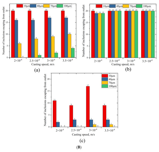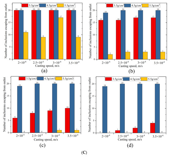 Almost all of the inclusions with a diameter of 10 μm and a density of 3.5 g/cm3 escaped. For inclusions with a density of 3.5 g/cm3 and diameters of 40, 70, and 100 μm, as the casting velocity increased, the number of inclusions that escaped gradually increased, and the removal effect gradually became worse. With the increase in the diameter of the inclusion, the number of inclusions with densities of 3.5 and 5.5 g/cm3 that escaped continuously decreased. The large diameter inclusions were removed more effectively, especially for the inclusions with a large diameter and large density.