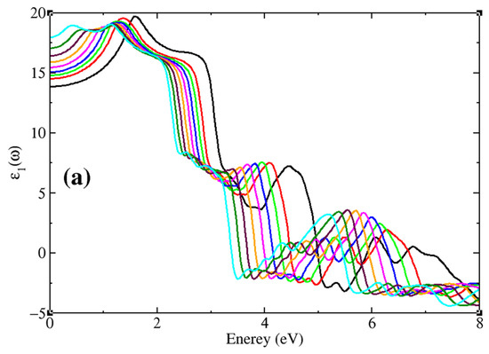 The frequency-dependent dielectric function ε1(ω) is shown in Figure 8a. The zero-frequency limit ε1(0), which is the electric part of ε1(ω) without pressure is 15.4. Under pressure, ε1(0) decreases monotonically from 13.82 to 17.92 as the pressure changes from −4% to 4% because it is inversely proportional to the band gap [74]. Beyond the zero-frequency limit, it increases smoothly around 18.9 eV and reaches its maximum value; it then decreases, with some notable variation, decreasing below zero in certain energy ranges. Finally, it increases from negative to positive, and the curve becomes smooth.