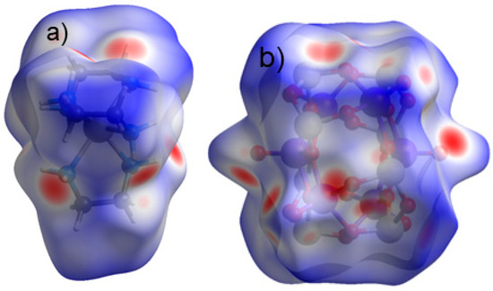 Cations and anions are connected by N-H⋯O and C-H⋯O hydrogen bonding interactions (Supplementary Materials, Tables S5–S7) generating a three-dimensional network. For gaining more insight into the intermolecular interactions a Hirshfeld surface analysis was performed [45,46,47,48]. A Hirshfeld surface is constructed applying the equation