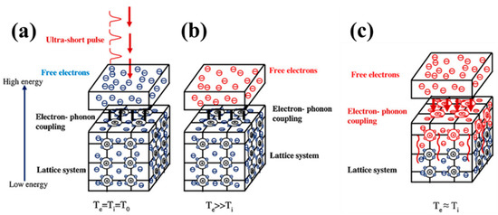 The interaction mechanism between the femtosecond laser and the material can be obtained as shown in Figure 1 [19]. It can be found that the pulse width of the ultrashort pulse laser is less than the electron-grain relaxation time (10–100 ps), so when the ultrashort pulse laser interacts with the material, only the free electrons on the top of the material can absorb the energy of the ultrashort pulse laser electrons in the conduction band absorb photons and gain higher energy. At this time, the electrons are heated to a high temperature as shown in Figure 1a, this excitation of the solid takes place during the laser pulse, and the lattice system is still at an ambient temperature as shown in Figure 1b. Due to the interaction of laser and matter, only the process of electrons being stimulated to absorb and storing energy occurs, which fundamentally avoids the transfer and conversion of energy, as well as the existence and thermal diffusion of thermal energy [20]. Therefore, the heat transfer mechanism between the ultrashort pulse laser and the material is different from the traditional heat transfer theory (Fourier law). After the laser pulse depositing energy, the nonequilibrium of temperatures drives the energy exchange between electrons and phonons. Thus, the thermodynamic equilibrium between the electronic system and the crystal lattice can be reached after multiple electron-phonon relaxation times (in the range of picoseconds) as shown in Figure 1c. Since the electron–phonon coupling strength depends on the properties of the conduction band electrons, the characteristic relaxation time of the temperature equilibration leads to a huge difference between different materials. Through this thermal conduction mechanism, the strength of the electron-phonon coupling determines the energy loss of the ultrashort pulse laser into the material and thermal damage zone [21]. The literature [22] pointed out that the electron-phonon coupling coefficient of the material has a decisive effect on the energy transfer. Corkum [23] also pointed out that the heat transfer range is determined by the electro-phonon coupling coefficient. So, the physical properties of the material and parameters such as the pulse time of the laser will significantly affect the energy absorption of the powder and the shape of the molten pool, and ultimately affect the performance of the products [24].