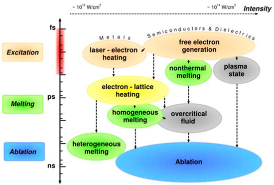 Based on different material and laser parameters, a series of phenomena which shows a very strong threshold effect begin to occur after laser irritation. An overview of typical involved phenomena in the considered parameter range is given in Figure 2 which shows pathways of the material from excitation to ablation, depending on the relevant timescale and intensity ranges [27]. When the laser energy exceeds the melting threshold, the material surface exhibits heterogeneous melting and gradually stabilizes; while exceed ablation threshold, the relaxation after homogeneous melting of the surface results in the expansion of the surface, followed by the generation of tensile stress waves, and when the tensile stress is large enough the matter is going to move, which is also called spallation; laser energy further reaches the evaporation threshold, the material will evaporate and even become plasma, the phase explosion state is reached. Thus, selecting a suitable processing parameters window based on the mechanism of action is necessary, it can also be used to microscopically analyze the non-equilibrium phase transition process of the interaction between ultrashort pulse laser and metal.