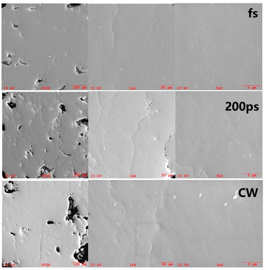 Cross section of tungsten sample, from top to bottom, made by fs,200 ps and CW; from left to right, SEM image of ×200, ×1000, ×5000 [56].