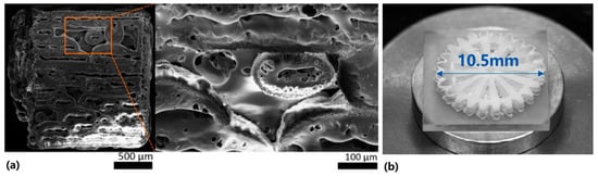 (a) SEM image (top view) of a fabricated cubic sample, exhibiting molten tracks and gas inclusions due to the high viscosity of glass. (b) Fabricated gear wheel with dimensions of 10.5 mm in diameter and 1.5 mm height [33].