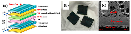 (a) Solid oxide fuel cell (SOFC) design architecture. A single cell unit include cathode (LSM), electrolyte (YSZ), and anode (Ni–YSZ), air is supplied to the cathode surface whereas fuel is supplied to the anode surface. (b) Complete three-layered cell samples (30 × 30 mm). (c) cross-section SEM image of the interfaces for a complete cell sample [72].