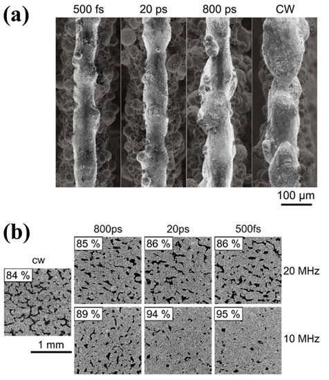 (a) SEM images of walls (top view) produced at different pulse width. (b)The corresponding relative densities of the samples produced using different pulse durations and repetition rates obtained by X-ray CT [15].