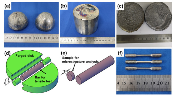 The processing samples of TiAlMn alloy: (a) ingots, (b) canned-forging specimens, (c) forged disks, (d) sampling position for tensile tests, (e) sampling position for microstructure analysis, (f) tensile specimens.