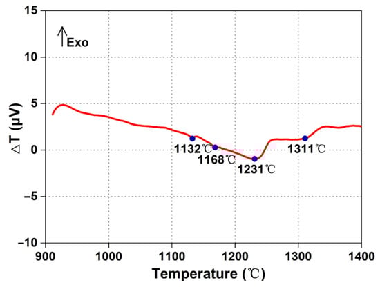 The DTA results of Ti42Al5Mn alloy showing the phase transformation temperatures.