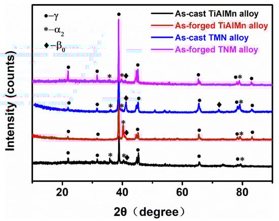 Figure 3 shows the XRD patterns of as-cast and as-forged TiAlMn and TNM alloys. The results manifest that the γ, α2, and β0 phases are identified in the as-cast and as-forged TiAlMn and TNM alloys. Like other TiAl structural materials, both alloys are based on the γ (TiAl) phase with the tetragonal L10 structure and the α2 (Ti3Al) phase with the hexagonal D019 structure [36]. Meanwhile, the appearance of the β0 phase with the bcc B2 structure in the as-cast TiAlMn alloy and TNM alloy is favorable to improving the high-temperature deformation capacity.