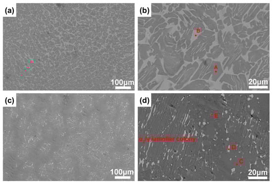 The SEM-BSE photos of as-forged TiAlMn and TNM alloys: (a,b) TiAlMn alloy, (c,d) TNM alloy.