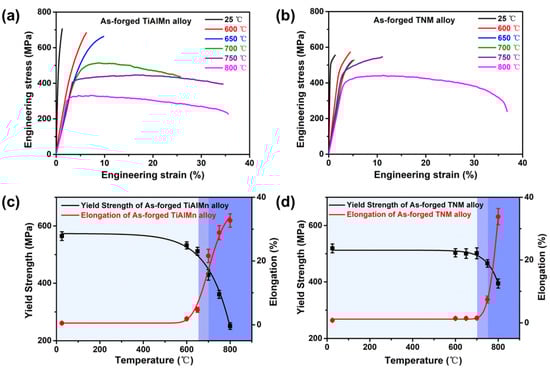 The tensile properties of as-forged TiAlMn alloy and TNM alloy: (a,b) the engineering stress–strain curves at different temperatures, (a) TiAlMn alloy, (b) TNM alloy; (c,d) the tensile properties as a function of the testing temperature, (c) TiAlMn alloy, (d) TNM alloy.