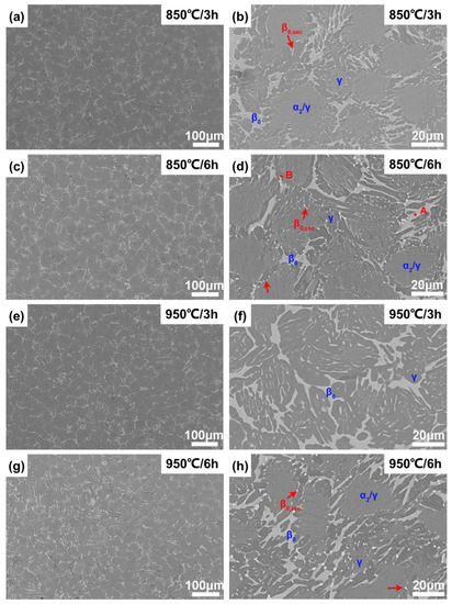 The SEM-BSE photos of TiAlMn alloy after different aging treatments: (a,b) HT1, (c,d) HT2, (e,f) HT3, (g,h) HT4.