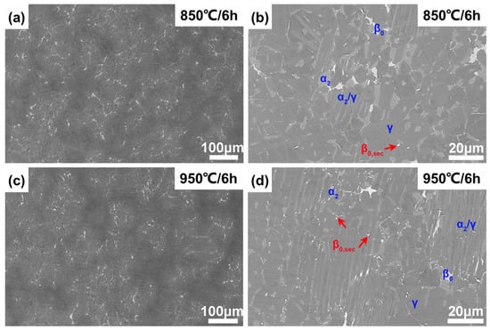 The SEM-BSE photos of TNM alloy after different aging treatments: (a,b) HT5, (c,d) HT6.