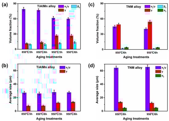 The statistical results of volume fraction and average size of the phases in the TiAlMn alloy and TNM alloy after different aging treatments: (a,c) volume fraction of phases, (b,d) average size of phases.