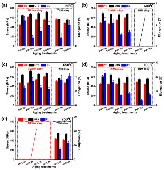 The tensile properties of the TiAlMn alloy and TNM alloy after different aging treatments as a function of the testing temperature: (a) 25 °C, (b) 600 °C, (c) 650 °C, (d) 700 °C, (e) 750 °C.