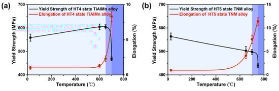 The optimal tensile properties of the heat-treated TiAlMn alloy and TNM alloy as a function of the testing temperature: (a) HT4 state TiAlMn alloy, (b) HT5 state TNM alloy.