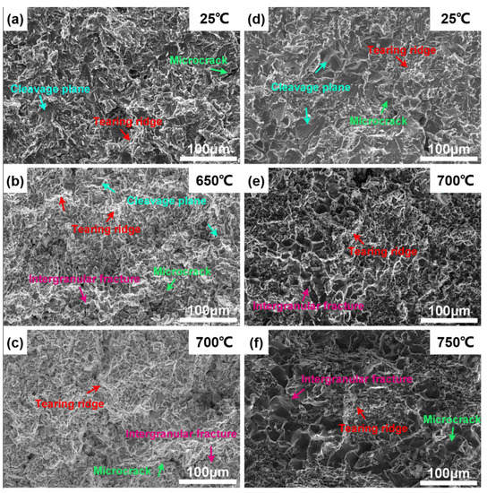 SEM micrographs of fracture surfaces on the tensile specimens of the HT4 state TiAlMn alloy and HT5 state TNM alloy: (a–c) The fracture surfaces of HT4 state TiAlMn alloy at different temperatures; (d–f) the fracture surfaces of HT5 state TNM alloy at different temperatures.