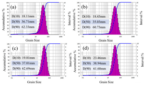 Particle size of Al-6.2Zn-2Mg-xSc-xZr alloys powder, (a) sample 1, (b) sample 2, (c) sample 3, (d) sample 4.