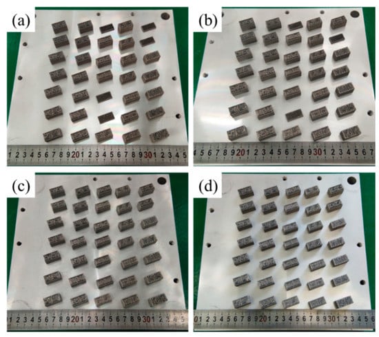 Al-6.2Zn-2Mg-xSc-xZr alloy sample fabricated by SLM, (a) sample 1, (b) sample 2, (c) sample 3, (d) sample 4.