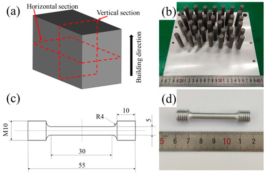 (a) schematic diagram of horizontal section and vertical section, (b) the blanks of tensile rods, (c) schematic diagram of dog-bone rod-shaped standard tensile specimen, (d) dog-bone rod-shaped standard tensile specimen.