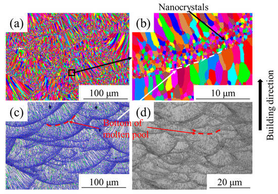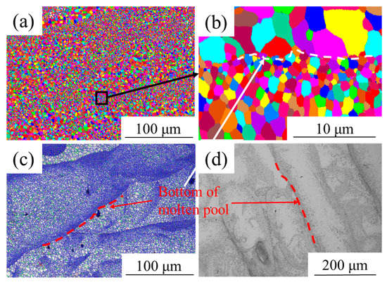 Figure 15a is the EBSD grain reconstruction of the sample 4. The microstructure is composed of fine equiaxed crystals on bottom of the molten pool, and coarse columnar crystal in the middle of the molten pool. Due to the overlap of adjacent melting pool and remelting between layers, there is no complete microstructure of the molten pool as shown in the schematic diagram (Figure 15b) inside the sample.