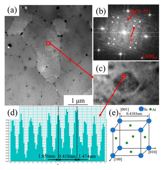 Figure 7a,b are the ECC picture of the Al-6.2Zn-2Mg-0.6Sc-0.36Zr alloy in the as-printed status. The Mg/Zn-rich nanoscale phases have a certain degree of aggregation at the grain boundaries. This indicates that the diffusion of elements is restricted under rapid cooling of SLM processing. However, due to the disordered arrangement of atoms at the grain boundary, the energy of the grain boundary increases, which provides the necessary driving force for the precipitation of the second phase. Figure 8 and Figure 9 show the TEM photo and selected area electronic diffraction analysis of the Al-6.2Zn-2Mg-0.6Sc-0.36 Zr alloy. It can be seen that the second phase is mainly the η′ phase according to Figure 7, Figure 8 and Figure 9 [53,54,55]. Fine grain strengthening and precipitation strengthening of Mg/Zn phase play a major role in strengthening of the Al-6.2Zn-2Mg-0.6Sc-0.36Zr alloys. As shown from Figure 9b, there were the obvious diffraction points appear at the [1 0 0] and [1 1 0] positions in the diffraction pattern of the [1 0 0]Al crystal belt axis. In the high-resolution electron microscope pictures (Figure 9c), a lattice arrangement different from the Al matrix phase was found. The measurement and calculation of the lattice in this area confirmed that the spacing of the interphase atomic columns was about 0.418 nm (Figure 9d). It is similar to the Al3Sc lattice parameter of 0.4103 nm [51]. And it is matched with the schematic diagram of the Al3Sc atomic structure shown in Figure 9e. The Al3(Sc, Zr) is formed by the substitution of Zr atom for Sc atom of the Al3Sc shell, and their lattice structures and lattice constants are similar. And combined with electron diffraction analysis (Figure 9b), it is determined that this phase is Al3(Sc, Zr) with L12 structure.