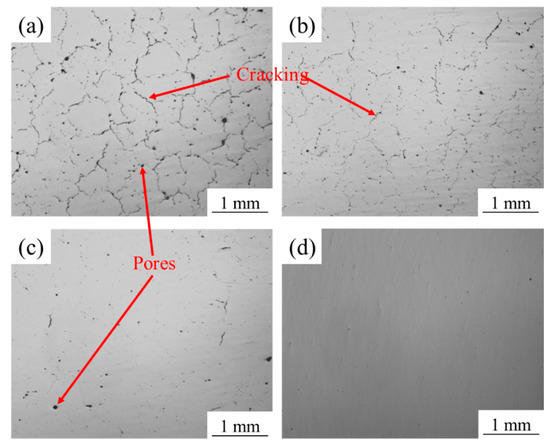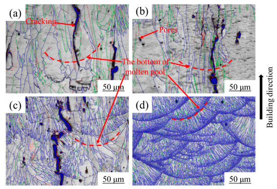 The epitaxial tendency of crack growth was largely due to the poor flowability of molten Al-Zn-Mg alloy and the high cooling rate of the SLM, which would lead to the inability of the molten alloy of current layer to refill pre-existing cracks [59]. If the pre-existing crack is not replenished by molten alloy, it would act as a source for further crack propagation to form a large crack, as shown in Figure 12. So, the sample 4 is completely no cracking, which mainly be due to the effect of grain refining.